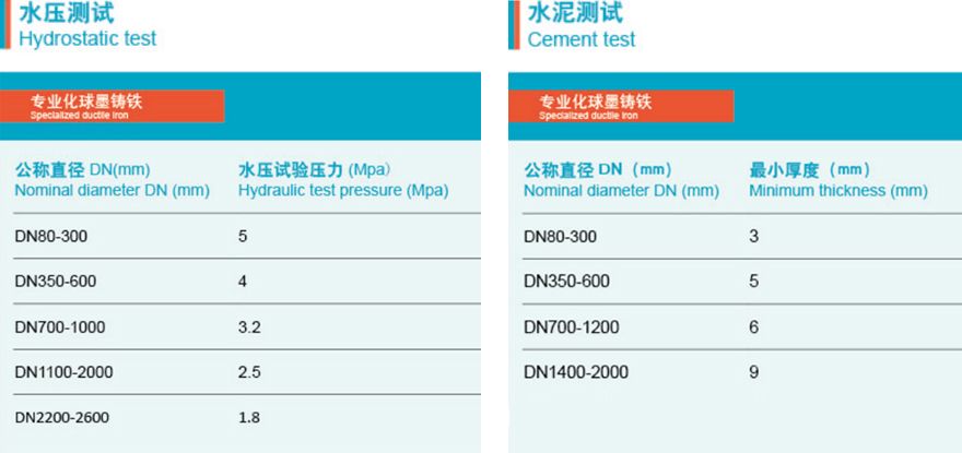 Each ductile iron pipe is subjected to strict on-line inspection. The test items include molten iron composition, metallographic phase, tensile strength, elongation, hardness, dimension, appearance, water pressure, cement lining thickness, zinc spraying thickness and paint spraying thickness to ensure that each product meets the standards.